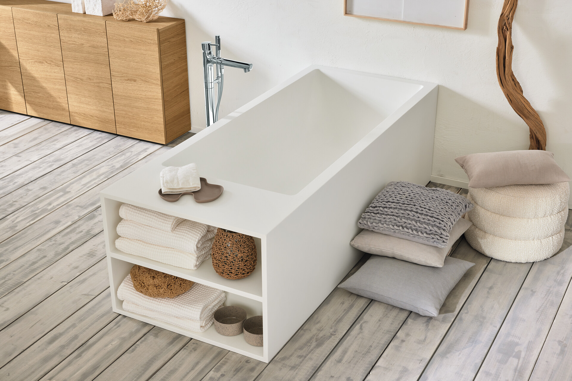 Von der Natur inspiriert. Gefertigt aus natürlichen Materialien zu formvollendeten Produkten. Aus der Feder der Designerin Anke Salomon. Mit white gelingen zeitlos schöne Bäder aus einem Guss, in denen wir perfekt entspannen können. Über alle Produktgruppen hinweg begeistern die Produkte der Designlinie white mit einer ruhigen, klaren und zeitlosen Schönheit. Alles ist von der Formensprache über das Material bis hin zu den Farben aufeinander abgestimmt und baut aufeinander auf. Wannen, Möbel und Spiegelschränke sind möglichst puristisch und monolithisch gehalten, Armaturen und Accessoires bilden einen leichten, filigranen Gegenpol.